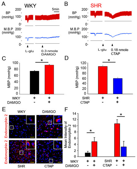 Activation of μOR in the NTS and cardiovascular regulation of WKY rats and SHRs. (A) Representative tracings demonstrating the cardiovascular effects of [D-Ala2, MePhe4, Gly5-ol]-enkephalin (DAMGO) (0.3 nmol) injected into the unilateral NTS of anesthetized WKY (▲ time of injection). (B) Representative BP recordings of an intra-NTS microinjection of the μOR antagonist CTAP in hypertensive SHRs (▲ time of injection). (C) Bar graphs showing the effects of 10-min treatment with DAMGO on the mean blood pressure (MBP) of anesthetized WKY. (D) Bar graphs showing the effects of 10-min treatment with DAMGO on the mean blood pressure (MBP) of anesthetized SHRs. (E,F) Representative red fluorescence images and the statistical analysis for Endomorphin-2-positive cells after DAMGO or CTAP treatment. The images were photographed at ×400 and 1000 magnification. The Mann–Whitney U-test was used for statistical analysis. Bar values are shown as mean ± SEM (n = 6); * p < 0.05 versus control.
