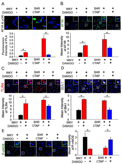 μOR elevates the formation of AT1R and μOR heterodimers, and induces the activation of microglia and the expression of TLR4 to impair the nNOS pathway in the NTS. (A) The in situ PLA (Proximity Ligation Assay) was used to confirm the formation of AT1R and μOR (μ-opioid receptors) heterodimers after intra-NTS DAMGO or CTAP microinjection. Green color indicates AT1R and μOR heterodimers; the nuclei were counterstained with DAPI. The images were photographed at 1000 magnification. (B–E) Representative fluorescence images of AT1R (green), TLR4 (red) microglial marker IBA-1 (white) and nNOSS1416 (green)-positive cells after intra-NTS DAMGO or CTAP microinjection. The images were photographed at ×400 and 1000 magnification. The Mann–Whitney U-test was used for statistical analysis. Bar values are shown as mean ± SEM (n = 6); * p < 0.05 versus control.