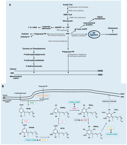Scheme of CoQ synthesis in mitochondria. (A) Synthesis of the mevalonate chain in the ER and quinone head processing from tyrosine in cytosol or mitochondrial matrix. (B) Assembly of benzene ring and isoprenoid tail at the inner mitochondrial membrane and further modifications of the phenol head at the inner mitochondrial membrane. Members of the CoQ-synthome are indicated in each step. In some cases, the enzyme involved in some of the steps are unknown. Regulatory enzymes such as COQ8 and COQ9 are indicated at the steps in which they are actively involved.