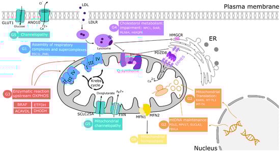Causes of secondary CoQ deficiency. Mechanisms proposed to trigger the secondary variant are grouped in several categories (G1 to G6) indicated in different colors. The synthesis of CoQ can be reduced by defects in proteins implicated directly or indirectly in the assembly and proper respiratory machinery functioning (G1 (blue) and G3 (red)). In orange (G2) are the essential proteins for the maintenance of intact mtDNA. Point mutations in mitochondrial aminoacyl-tRNA synthetases are also associated with low CoQ levels. The stability of Q-synthome depends on ER-mitochondrial contact sites (ERMES) and the cholesterol synthesis pathway (G4 (purple)). Defects in the proteins implicated in the transport of several metabolites, such as glucose or Fe2+, throughout to plasm or mitochondrial membrane cause channelopathies, marked in green (G5). The mechanisms to maintain mitochondrial mass by processes such as fusion-fission proteins, MFN1, and MFN2 (G6) are shown in yellow.