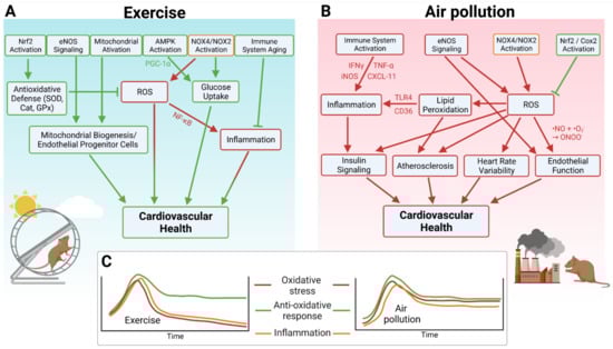 (A) Major pathways by which exercise improves cardiovascular health as inferred from animal studies. (B) Major pathways by which air pollution negatively influences cardiovascular health. (C) Chronic versus acute exposure to exercise or air pollution. Oxidative stress and inflammation are acutely elevated during both exercise and air pollution exposure, but decrease after exercise and remain high after air pollution. Antioxidative defense also increases acutely following either exercise or air pollution exposure, but remains high in both scenarios, resulting in a long-term benefit of exercise. Created with BioRender.com, accessed on 4 November 2021.