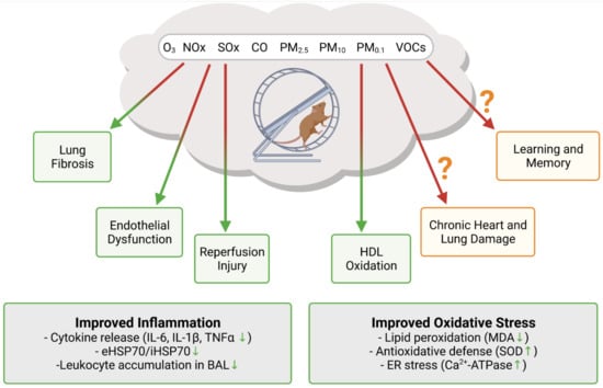 Translational research into the potentially offsetting effects of air pollution on the benefits of exercise is very scarce. An overview of the available data on exercise in polluted air from animal studies is shown in Figure 2. The majority of research investigating the combined effects focuses on the pulmonary system, as the lung is usually the first organ to interact with PM after inhalation. Lung fibrosis is known to be both caused and worsened by ambient PM [,]. A study on bleomycin induced lung fibrosis demonstrated that aerobic exercise reduced the severity of inflammation and fibrosis in this model []. Most notably, inflammation markers IL-6 and IL-1β were reduced in the bronchoalveolar lavage (BAL), together with collagen fiber deposition and Akt phosphorylation in the lung tissue. Pulmonary inflammation in response to the PM2.5 and PM10 exposure of mice, as measured by the accumulation of neutrophils and macrophages in the BAL, was significantly reduced after treadmill training []. Importantly, these effects also appear to be systemic: inflammation markers in the plasma, IL-1β, TNF-α, and CXCL1/KC were also reduced in the treadmill exercise group. A study on thoroughbred racehorses showed that accumulation of tracheal mucus was associated with the breathing PM10 concentration, adding evidence that the pulmonary system suffers from air pollution []. The anti-inflammatory effects of exercise were also demonstrated in mice exposed to diesel PM [] and hamsters exposed to O3, as neutrophil levels were increased after O3 exposure, but unchanged after exercise []. Not all research reports point to a beneficial effect of exercise on the air pollution induced lung injury. The study on hamsters also demonstrated increased levels of F2-isoprostanes, a marker of lipid peroxidation, after exercise in O3-rich environment []. A study on bronchoalveolar mucosal permeability to bovine serum albumin and diethylenetriamine pentaacetate in rats exposed to O3 and NO2 with and without exercise, showed that airway permeability was greater in the exercise group, however, without providing data on the enzymatic antioxidant capacity []. In addition, airway permeability remained high 48 h after the O3 treatment in the exercise group but not in the inactive group, where it returned to the level of the fresh air control. Another study on diesel PM exposed mice also demonstrated that airway permeability was more pronounced in the exercise group in comparison to the inactive group []. The authors of this study concluded that exercise does not exert an anti-inflammatory effect in the lung, but, rather, provides physiological adaption of the airways. These studies, while not directly addressing the cardiovascular consequences or benefits of exercising in polluted air, indicate that, under these circumstances, increases in ventilation rate may accelerate systemic inflammation, a known cardiovascular risk factor [,].