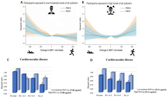 (A) Combined effects of low/moderate levels of PM2.5/10 and changes in physical activity on subsequent cardiovascular disease risk in young adults, suggesting large increases in physical activity to positively affect cardiovascular health in low/moderate air polluted areas. (B) Combined effects of high levels of PM2.5/10 and changes in physical activity on subsequent cardiovascular disease risk in young adults, suggesting large increases in physical activity to negatively affect cardiovascular health in highly air polluted areas. (A,B) reused from [] with permission; Copyright © 2021, Oxford University Press. (C) Moderate to vigorous physical activity (PA) frequency was significantly (* p < 0.05, subjects with no moderate to vigorous physical activity and low/moderate PM2.5 exposure are the reference group) associated with decreased risk of cardiovascular disease in subjects exposed to low/moderate as well as high levels of PM2.5. (D) Moderate to vigorous physical activity (PA) frequency was significantly (* p < 0.05, subjects with no moderate to vigorous PA and low/moderate PM10 exposure are the reference group) associated with decreased risk of cardiovascular disease in subjects exposed to low/moderate as well as high levels of PM10. (C,D) reused from [] with permission; © 2021 The Authors; published on behalf of the American Heart Association, Inc., by Wiley; open access article under the terms of the http://creativecommons.org/licenses/by-nc-nd/4.0/, accessed on 4 November 2021, License.