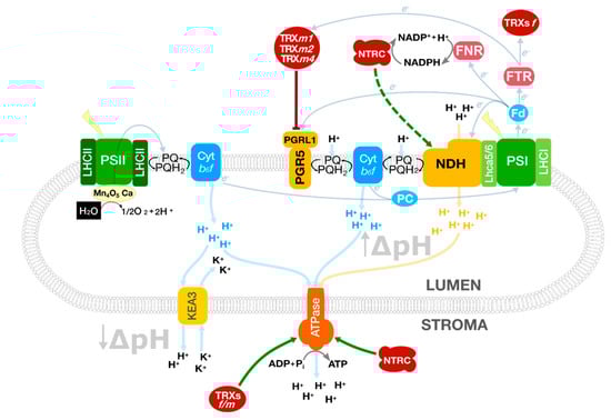Most of life on Earth is sustained by photochemical reactions. In general terms, in the so-called linear electron flow (LEF), photosynthetic light reactions involve three multi-protein complexes: photosystems (PS) II and I, and the cytochrome b6f (Cyt b6f) complex [1,2]. PS are associated with light-harvesting complexes (LHCs), which are responsible for sunlight absorption in plants and green algae [3,4]. LEF starts with the photo-induced water oxidation that donates electrons to PSII and ends with the ferredoxin (Fd) reduction by PSI. Additionally, a balancing cyclic electron flow (CEF) works together with LEF to fine-tune the whole photosynthetic process [5,6]. CEF depends on additional photosynthetic complexes: the NADH dehydrogenase-like (NDH) complex and/or the ferredoxin/PROTON GRADIENT REGULATION 5 (PGR5)/PGR5-LIKE PHOTOSYNTHETIC PHENOTYPE 1 (PGRL1) complex.