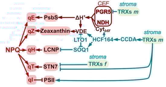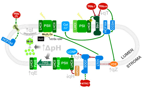 Light energy reaching the chloroplast can be either emitted as chlorophyll fluorescence or quenched by photochemical (qP) and non-photochemical mechanisms (qN or NPQ). When qP is not sufficient to assimilate all the absorbed energy, a fraction of it must be released as heat by NPQ. NPQ has different components: qE (energy-dependent quenching), qZ (zeaxanthin-dependent quenching), qT (state-transition quenching), qI (photo-inhibitory quenching) and qH (sustained and slowly reversible quenching) [80,81,82]. Behind all these photoprotective mechanisms, there is a dynamic redox network in which TRXs play active roles [28]. It follows now a discussion of the relevance of TRXs in the regulation of the different NPQ components (Figure 2).