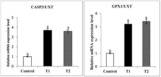 The qRT-PCR validation of mRNA expression for BAX/UXT, BCL2/UXT, CASP3/UXT, and GPX1/UXT in liver tissue; cell lymphoma2: BAX/UXT+ BCL2/UXT; caspase: CASP3/UXT; glutathione peroxidase: GPX1/UXT. a,b,c values in the same box with a different superscript differ significantly at p < 0.05.