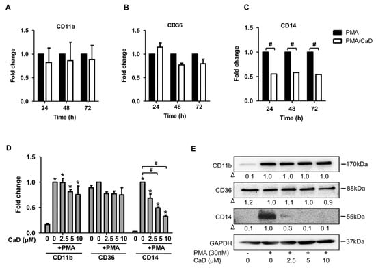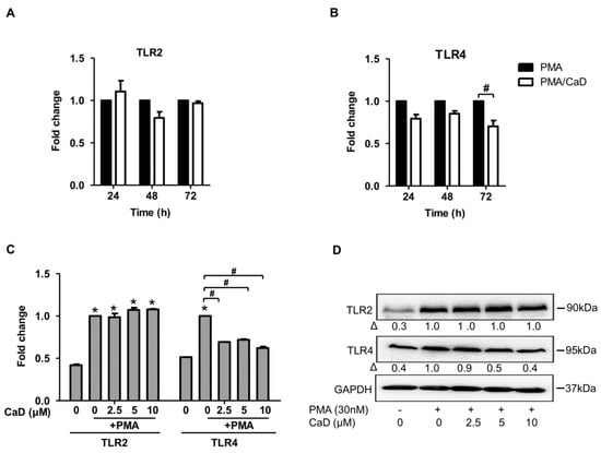 CaD on TLR4 expression during monocyte-to-macrophage differentiation. THP-1 monocytes were pretreated with 10 µmol/L of CaD for 1 h followed by stimulation with PMA (30 nmol/L) for various time points (A,B), or THP-1 monocytes were treated with various concentrations (0–10 µmol/L) of CaD for 1 h (C–D) followed by PMA treatment for 72 h. TLR2 and TLR4 transcripts (A–C) and protein levels (D) were measured by quantitative RT-PCR and Western blotting, respectively. Δ, fold-change normalized to PMA only (n = 3–4, mean ± SEM. * p < 0.05 vs. no treatment, # p < 0.05 vs. PMA only, Student’s t-test (A,B), or one-way ANOVA (C)). The Western blot represents one from at least three independent experiments.