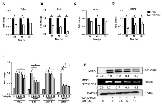 CaD inhibits PMA-induced inflammation during PMA-induced monocyte-to-macrophage differentiation. THP-1 monocytes were pretreated with CaD (10 µmol/L) for 1 h followed by stimulation with PMA (30 nmol/L) for various time points (A–D), or THP-1 monocytes were treated with various CaD concentrations (0–10 µmol/L), followed by PMA treatment for 48 h (E,F). TNFα, IL-1β, MCP-1, and MMP9 transcript levels were measured by quantitative RT-PCR, and MMP9 protein levels and activity were measured by Western blotting and gelatin zymography, respectively. Δ, fold-change normalized to PMA only (n = 3–4, mean ± SEM. * p < 0.05 vs. no treatment, # p < 0.05 vs. PMA only, Student’s t-test (A–D), or one-way ANOVA (E)). The Western blots represent one from at least three independent experiments.