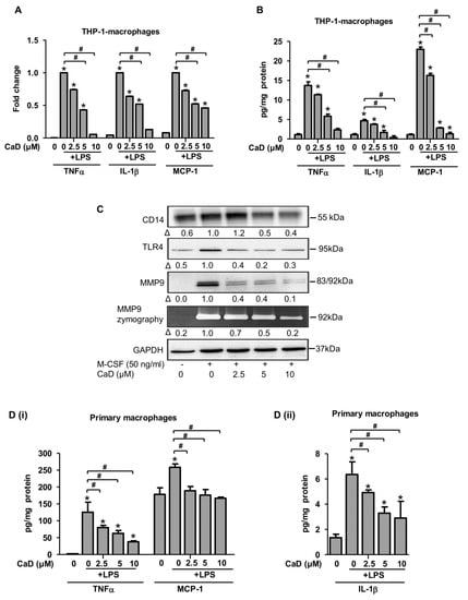 Although THP-1 cells are a human cell line, they are immortalized monocytic leukemia. So we looked to translate our results to primary human macrophages, using in vitro differentiation of monocytes. Specifically, isolated human monocytes were cultured with M-CSF (50 ng/mL) and various CaD concentrations. CaD significantly inhibited CD14, TLR4, and MMP9 protein expression than the M-CSF only treated macrophages in a concentration-dependent manner (Figure 4A). Finally, we wanted to study the effects of CaD on CD14 and TLR4 inflammatory signaling for the differentiated primary macrophages when stimulated with LPS (100 ng/mL) for 24 h. As a readout, we measured the levels of pro-inflammatory cytokines (IL-1β, TNFα, and MCP-1). In agreement with the decreased CD14 and TLR4 expression due to CaD, we observed a significant reduction in all the cytokines tested in response to LPS (Figure 4D). Therefore, the effects of CaD during PMA-induced THP-1 differentiation translate through to human primary macrophage function.