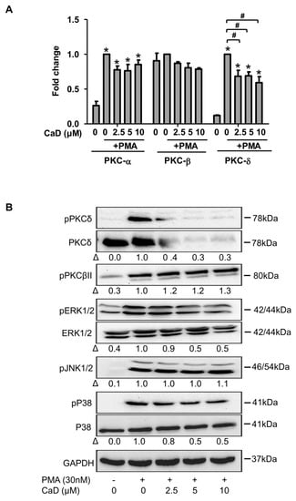Effect of CaD on PKCδ-MAPK signaling during PMA-induced monocyte-to-macrophage differentiation. THP-1 monocytes were pretreated with various concentrations (0–10 µmol/L) of CaD for 1 h, followed by PMA treatment for 24 h (A) or 30 min (B). PKCα, PKCßII, and PKCδ transcript levels (A) were measured by quantitative RT-PCR, and phosphorylation of PKC and MAPK pathway components (B) was measured by Western blotting. Δ, fold-change normalized to PMA only (n = 3, mean ± SEM. * p < 0.05 vs. no treatment, # p < 0.05 vs. PMA only, one-way ANOVA). The Western blots represent one from at least three independent experiments.