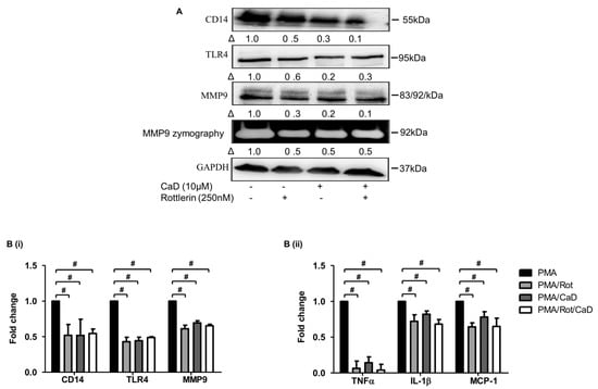 To determine whether the effect of CaD on PKCδ is necessary to inhibit CD14, TLR4, MMP9, and pro-inflammatory cytokine expression, we inhibited PKCδ (rottlerin) in the PMA-THP-1 model. Figure 6 indicates that, compared to rottlerin, CaD likewise significantly downregulated CD14, TLR4, MMP9, TNFα, IL1β, and MCP-1 expression, suggesting that CaD inhibits monocyte-to-macrophage differentiation by inhibiting PKCδ activation.