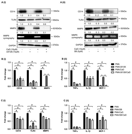 Moreover, inhibiting MAPK downregulates CD14, TLR4, MMP9, and inflammatory marker expression [39,40,41]; we, therefore, inhibited ERK1/2 (U0126) and p38 (SB203580) in the PMA THP-1 cell model in the presence or absence of CaD. Like CaD treatment, both MAPK inhibitors significantly inhibited CD14 and TLR4, MMP9, IL1β, TNFα, and MCP-1 expression (Figure 7). Put together, our findings indicate that PKCδ, ERK1/2, and p38 are the key pathways that CaD targets to inhibit monocyte-to-macrophage differentiation and inflammation.