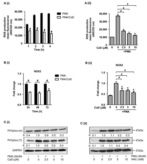 NADPH oxidase is critical for ROS generation in phagocytic cells, and ROS are implicated in various cell signaling processes, including monocyte-to-macrophage differentiation [43]. We next investigated the effect of CaD on PMA-triggered ROS generation, NOX-2/p47phox activation, and p47phox membrane translocation. We used N-acetylcysteine (NAC) as a ROS scavenger control to investigate its effect on p47phox activation and membrane translocation. Figure 9(Ai) shows that although ROS production increased with time, CaD quenched PMA-induced ROS production time independently; moreover, CaD blocked ROS generation dose-dependently. Both CaD and NAC inhibited PMA-triggered NOX2/p47phox expression and membrane translocation (Figure 9B,C).