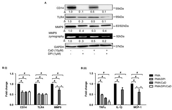 ROS regulate LPS and glucose-mediated NF-kB activation and inflammatory marker expression in human monocytes/macrophages [38,44]. Therefore, we investigated the effects of CaD on LPS and high glucose-induced p47phox activation and membrane translocation. Supplementary Figure S4A,B indicates that CaD significantly inhibited LPS and glucose-induced p47phox activation and membrane translocation. We further validated the role of ROS, NADPH oxidase, and the effect of CaD during monocyte-to-macrophage differentiation and inflammation in THP-1 cells by inhibiting NADPH oxidase (NOX2, p47phox) with a NADPH oxidase inhibitor (diphenyleneiodonium chloride, DPI), or NAC, in the presence or absence of CaD. DPI suppressed CD14, TLR4, MMP9, TNFα, IL1β, and MCP-1 expression (Figure 10), and NAC suppressed CD14, TLR4, and MMP9 expression (Supplementary Figure S5A) (we did not investigate the effect of NAC on pro-inflammatory cytokines as this question has been widely discussed).