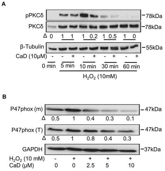 Because H2O2 activates PKCδ [50] and induces oxidative stress [51], we further investigated the effect of CaD on H2O2-induced PKCδ activation. As expected, H2O2 activated PKCδ as early as 5 min, and PKCδ phosphorylation was depleted by 30 min in H2O2-treated THP-1 cells (Figure 11A). CaD treatment significantly abolished the effect of H2O2 on PKCδ and p47phox activation (Figure 11A,B). These data showed that CaD is a ROS scavenger that downregulates PKCδ signaling.