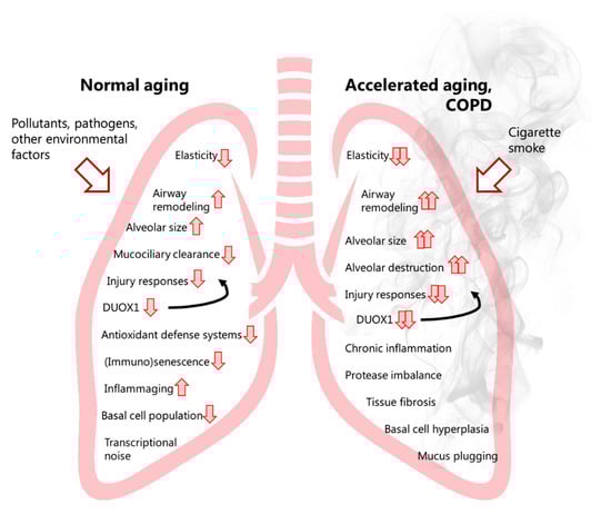 Because the respiratory system represents a critical interface with the external environment and is susceptible to injury from inhaled environmental pathogens and pollutants, it is equipped with various defense mechanisms (antioxidant defenses, antimicrobial defenses, mucus and mucociliary clearance mechanisms, and local sentinel immune cells). Age-related decline in these mechanisms likely contributes to biochemical and physiological changes in the lung, and may contribute to the development of age-related chronic lung disease(s) [40,41,42]. Indeed, while the senile lung is characterized by airspace enlargement in the absence of overt inflammation and tissue remodelling, such compromised and inappropriate responses to exogenous hazards in the ageing lung likely contribute to chronic inflammation and alveolar wall destruction that contribute to the development of e.g., emphysema [43,44], and also render the aged lung more susceptible to acute injury or infections that contribute to exacerbations, and may in turn further aggravate lung ageing. Hence, the molecular mechanisms underlying chronic lung diseases such as COPD are also dictated by alterations that occur as a result of normal aging. Recent efforts using single-cell transcriptomics and proteomics to develop an atlas of normal aging, such as the Tabula Muris Senis database [45], have dramatically increased our insights into (lung) cell-type specific effects of ageing [46], and present highly useful resources to assess the contributions of ageing to chronic age-related diseases, including those of the lung.