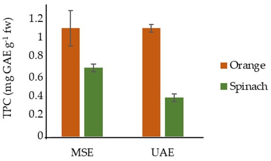 3.2. Total Phenolic Content and Antioxidant Activity of Orange and Spinach Wastes