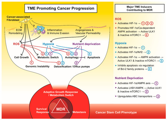 The tumour microenvironment (TME) promotes cancer progression to a multi-drug resistant (MDR) phenotype. The major components of TME, i.e., cancer-associated fibroblasts, reactive oxygen species (ROS), hypoxia, and nutrient deprivation, drive tumours to an adaptive growth, survival and metastatic phenotype that is often attributed to cancer stem cells.