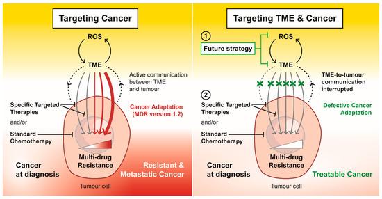 Targeting tumour microenvironment (TME) as a future strategy to overcome multi-drug resistance. In response to specific targeted therapies and standard chemotherapeutics, external and internal stress within the TME drives and promotes cancer adaptation in the form of drug resistance and metastasis. Targeting the ROS-TME circuit interrupts the TME-to-tumour communication that maintains a multi-drug resistance phenotype. This future strategy to target TME has the potential to disrupt the cancer adaption response, which could re-instate the efficacy of specific targeted therapies and standard chemotherapeutics in an attempt to treat cancer successfully.