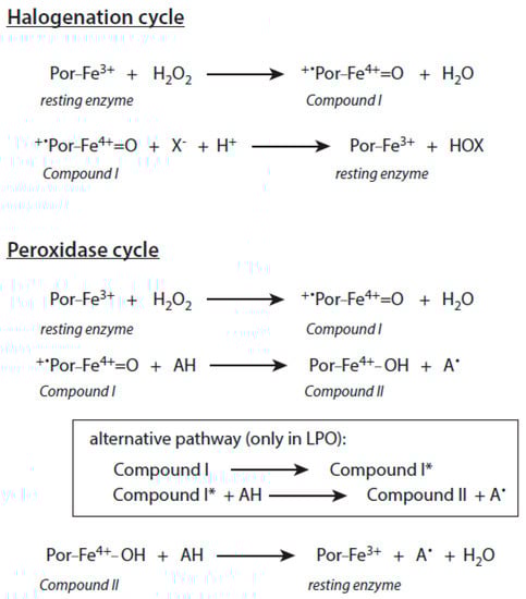The reaction sequence (ferric enzyme → Compound I → Compound II → ferric enzyme) is known as the peroxidase cycle (Figure 2). In the case of LPO, the conversion of Compound I to Compound II can also occur via Compound I*, which is formed from Compound I by an isoelectronic transition.
