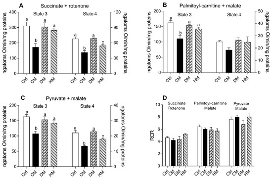 Respiration rates of cardiac mitochondria were measured in the presence of succinate-rotenone, palmitoyl carnitine-malate or pyruvate-malate as substrates. It is noteworthy that the stoichiometry of ATP synthesis to oxygen consumption is lower when lipids rather than carbohydrates are oxidized [53]. Regardless of the substrates used, state 3 and state 4 mitochondrial oxygen consumptions were significantly reduced in CM-treated animals when compared to the other groups (p < 0.01 vs control and DM-treated) (Figure 3A–C). In the presence of palmitoyl-carnitine, no significant differences were observed in state 4 respiration rates between different groups (Figure 3B). The quality of mitochondrial preparations was assessed by the respiratory control ratio (RCR) (Figure 3D).