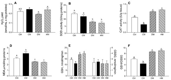 The DM administration decreased mitochondrial H2O2 release compared to CM or HM treatments (p < 0.05) (Figure 4A). DM- and HM-treated groups showed a significantly lower SOD activity than control (p < 0.01) or CM-treated animals (p < 0.05) (Figure 4B). In addition, CM-supplemented rats showed a significant reduction in CAT activity as compared to other groups (p < 0.001) (Figure 4C) and exhibited the highest lipid peroxidation index (MDA) (p < 0.01 vs control; p < 0.001 vs. DM- and HM), whereas the lowest values were detected in DM- and HM-animals (Figure 4D).