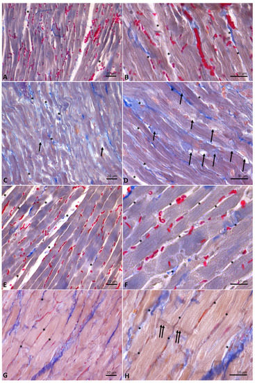 Longitudinal sections of rat hearts stained with Mallory’s trichrome stain. (A,B): controls. (C,D): donkey milk (DM) diet supplementation. (E,F): human milk (HM) diet supplementation. (G,H): cow milk (CM) diet supplementation. Legends: arrow, adipocyte; asterisk, intercellular space, double arrow, intercalated discs. Scale bar: (A,C,E,G), 20 µm; (B,D,F,H), 10 µm.