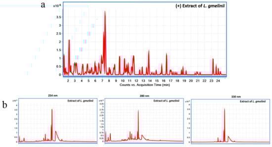 Chemical characterization of L. gmelinii root extract using Liquid chromatography diode array detector-quadrupole time-of-flight mass spectrometry (LC-DAD-QToF). LC-MS chromatogram of L. gmelinii extract in (+)ESI mode using LC-QToF (a); LC-UV chromatogram of L. gmelinii extract at 254, 280, and 330 nm using LC-DAD (b).