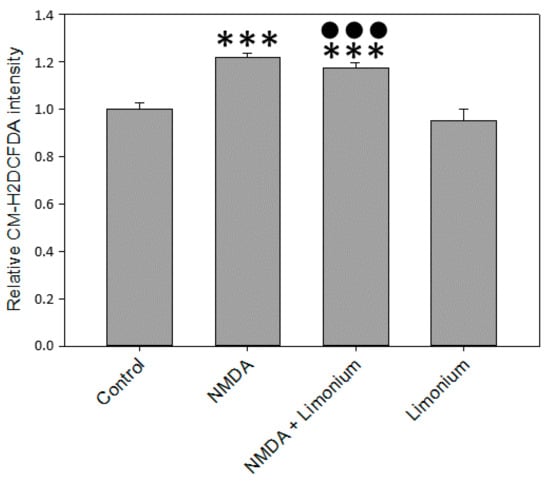 L. gmelinii extract inhibits ROS in human primary neurons exposed to NMDA. The level of ROS is represented by the relative intensity of CM-H2DCFDA normalized to the control group. ***—p ≤ 0.001 compared to the control; ●●●—p ≤ 0.001 compared to the group treated with NMDA.