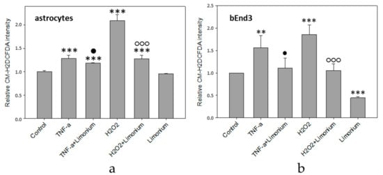 The results of quantitative fluorescence analysis of the level of ROS generation in astrocytes and bEnd3 cells exposed to TNF-α are presented in Figure 3. As a positive control, we exposed the cells to H2O2, which is a known source of ROS. According to the data obtained, the treatment of astrocytes with TNF-α and H2O2 resulted in a 28 and 100% increase in the production of ROS, respectively, as compared to control (p ≤ 0.001) (see Figure 3a). Pre-treatment of the cells with the extract from L. gmelinii prevented the accumulation of ROS in astrocytes. As compared to cells that were exposed to TNF-α or H2O2 alone, ROS indicator was reduced by 10 and 73%, respectively (p ≤ 0.01, p ≤ 0.001). At the same time, the extract itself did not influence the generation of ROS in astrocytes, as there was no significant changes in the fluorescence intensity of the dye in this group. Similarly, the treatment of bEnd3 cells with TNF-α and H2O2 resulted in a 56 and 86% increase, respectively, in the production of ROS (p ≤ 0.01, p ≤ 0.001), while the presence of L. gmelinii extract completely attenuated accumulation of ROS in these cells (p ≤ 0.05, p ≤ 0.001). Moreover, the Limonium extract itself was capable of significantly reducing the generation of ROS in bEnd3 cells (p ≤ 0.001), (see Figure 3b).