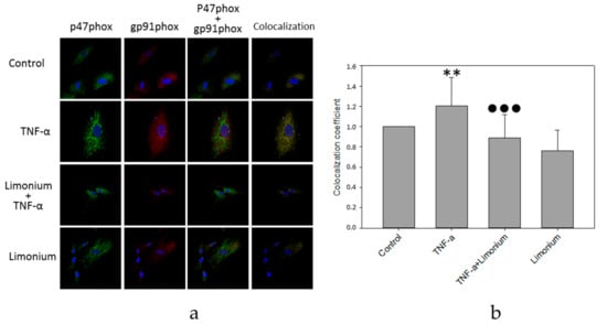 To further access antioxidant properties of L. gmelinii, we investigated the activity of NADPH oxidase in human primary astrocytes in the presence of TNF-α. NADPH-oxidase is a trans-membrane enzymatic complex comprising of two membrane-bound subunits (gp91-phox, p22-phox), three cytosolic subunits (p67-phox, p47-phox and p40-phox), and a low-molecular-weight G protein [26]. Several researchers have demonstrated that NADPH-oxidase actively participates in the production of ROS in astrocytes [24,27,28,29]. Since NADPH oxidase was activated by the assembly of the membrane-bound subunits with its cytosolic components, we tested the effects of L. gmelinii extract on co-localization of gp91phox and p47phox subunits by analyzing confocal images of double immunofluorescent-labeled gp91-phox and p47-phox in rat primary astrocytes (see Figure 4a,b).