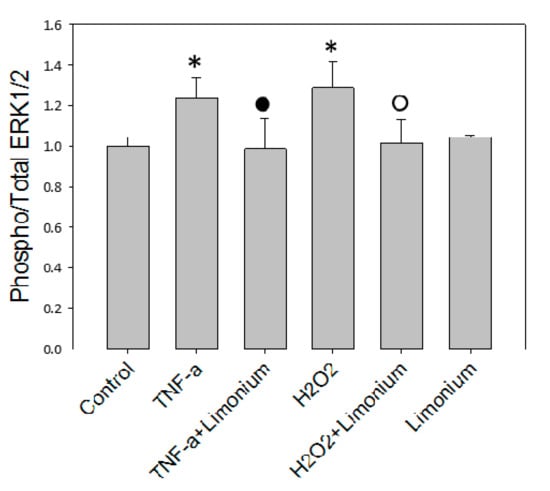 L. gmelinii extract suppresses activation of ERK 1/2 kinase induced by TNF-α in astrocytes. *—p ≤ 0.05 compared to the control; •—p ≤ 0.05 compared to the group treated with TNF-α; ○—p ≤ 0.05 compared to the group treated with H2O2.