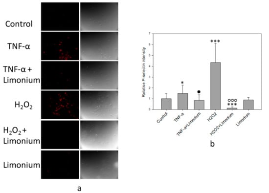 L. gmelinii extract suppresses TNF-α and H2O2-induced expression of P-selectin on the cell surface. Fluorescent images of P-selectin labeled bEnd3cells (a); relative intensity of P-selectin in the bEnd3 (b). ***—p ≤ 0.001 compared to the control; *—p ≤ 0.05 compared to the control; •—p ≤ 0.05 compared to the cells treated only with TNF-α; ○○○—compared to the cells treated only with H2O2.