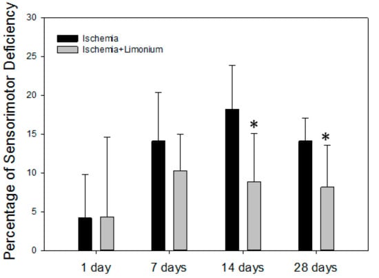 L. gmelinii extract improves motor coordination of rats with induced ischemic stroke after 14 and 28 days of treatment. The percentage of motor deficiency was calculated and normalized to the control trials (before surgery, represented as a 0 point). *—p ≤ 0.05 compared to the animals with ischemia only.