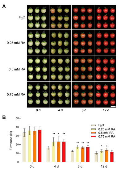 Tomato fruits were collected at 0 d, 4 d, 8 d, and 12 d after soaking treatments with different RA concentrations or H2O as control. As illustrated in Figure 1A, 0.25 mM, 0.5 mM, and 0.75 mM RA soaking treatments inhibited tomato fruit color change during storage at 4 and 8 d, compared with the control treatment. In addition, RA treatment also maintained higher firmness than control during storage from 4 d to 12 d (Figure 1B). These results indicated that RA treatment retarded the color change and ripening of tomato fruits.