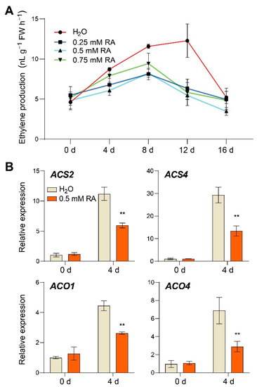 RA inhibited ripening-induced ethylene biosynthesis signaling. Effects of RA treatment on (A) ethylene production, and (B) transcript abundance of ethylene biosynthesis genes ACS2, ACS4, ACO1, and ACO4. The transcript abundance of each gene under control at 0 d was defined as 1. Tomato fruits at the mature green stage were treated with 0.25 mM, 0.5 mM, 0.75 mM RA, or H2O control. The fruit samples were collected at the indicated time points for ethylene content quantification and qRT-PCR analysis. The data are presented as mean values ± SD; n = 4 in (A), 3 in (B). Asterisks in (B) indicate statistically significant differences (** p ≤ 0.01) compared with control under the same time point, as determined by Student’s t-test.