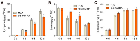 RA affected carotenoid biosynthesis during fruit ripening. Effects of RA treatment on (A) lycopene content, (B) lutein content, and (C) β-carotene content during fruit ripening. Tomato fruits at the mature green stage were treated with 0.5 mM RA, or H2O control. The fruit samples were collected at the indicated time points for carotenoid content quantification. The data are presented as mean values ± SD; n = 3. Asterisks indicate statistically significant differences (* p ≤ 0.05, ** p ≤ 0.01) compared with control under the same time point, as determined by Student’s t-test.