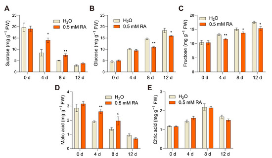 RA influenced sugar and organic acid accumulation during fruit ripening. Effects of RA treatment on (A) sucrose content, (B) glucose content, (C) fructose content, (D) malic acid content, and (E) citric acid content. Tomato fruits at the mature green stage were treated with 0.5 mM RA, or H2O control. The fruit samples were collected at the indicated time points for sugar and organic acid content quantification. The data are presented as mean values ± SD; n = 3. Asterisks indicate statistically significant differences (* p ≤ 0.05, ** p ≤ 0.01) compared with control under the same time point, as determined by Student’s t-test.