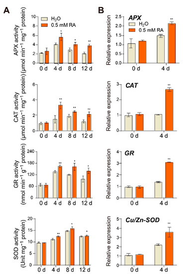 At early ripening stages, the increasing respiratory rates in tomato fruits are typically accompanied by a ROS burst [23]. The activation of antioxidant enzymes such as APX (ascorbate peroxidase), CAT (catalase), GR (glutathione reductase), and SOD (superoxide dismutase) could protect fruits against oxidative stress during fruit ripening and senescence [2]. To better understand the effects of RA treatment on the fruit antioxidant system, we analyzed the activity of antioxidant enzymes. As illustrated in Figure 5A, ripening-induced increase in the activity of APX, CAT, GR, and SOD was further promoted by RA treatment, and RA-mediated higher antioxidant enzyme activity could be still distinguished at 12 d after treatment. Consistent with the enzyme activity, the transcript abundance of genes encoding APX, CAT, POD, and SOD was also largely induced by RA treatment at 4 d of the early ripening stage (Figure 5B).