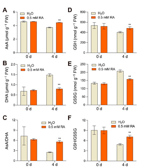 Beside diverse antioxidant enzymes, antioxidant metabolites also play an indispensable role in the antioxidant system, among which ascorbate and glutathione act as the heart of the cytosol redox hub regulating redox homeostasis [24]. Generally, the changes in the ratios of reduced ascorbate to dehydroascorbate (AsA/DHA) and glutathione to glutathione disulfide (GSH/GSSG) reflect the alterations in redox status. The AsA content reduced and the DHA increased in H2O-treated fruits at 4 d of the early ripening stage, which led to a decline in the AsA/DHA ratio (Figure 6A–C). Notably, RA treatment was able to prevent the decline in AsA content, and inhibit the DHA accumulation, eventually keeping a higher level of the AsA/DHA ratio in fruits compared to that with control treatments (Figure 6A–C). Similarly, RA treatment also significantly induced the GSH content and substantially suppressed the GSSG content, protecting the GSH/GSSG ratio from further reduction during ripening (Figure 6D–F). These findings indicate that RA plays a positive role in strengthening the antioxidant system by activating antioxidant enzyme activity and regulating the redox status of antioxidant metabolite during tomato fruit ripening.