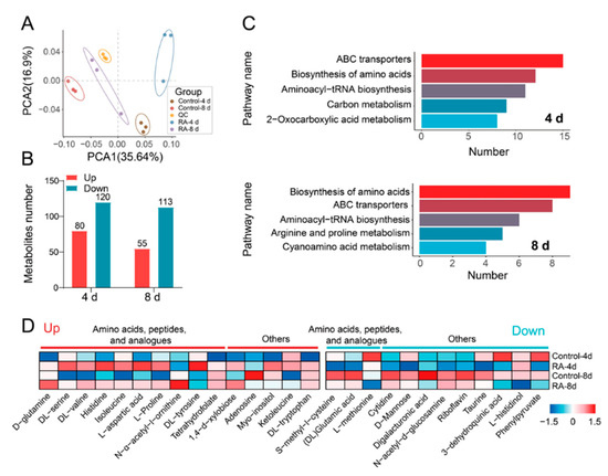 Effects of RA treatment on fruit metabolome. (A) PCA of metabolites as influenced by RA treatment at 4 and 8 d. (B) Number of metabolites increased or decreased by RA treatment at 4 and 8 d, respectively. (C) Top 5 enriched KEGG pathways based on RA-regulated differentially accumulated metabolites (DAMs) at 4 and 8 d, respectively. (D) Heatmap indicates the relative metabolite abundance of RA-regulated DAMs within the top 3 enriched KEGG pathways of ABC transporters, the biosynthesis of amino acids, and the aminoacyl-tRNA biosynthesis. The original metabolite abundance was subjected to data adjustment by normalization using an R package. Red and blue lines indicate the up- and down-regulated metabolites by RA treatment at 4 and 8 d, respectively. The color scale on the right indicates relative metabolites abundance.