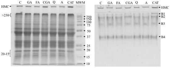 SDS–PAGE (left side) and BN-PAGE (right side) electrophoretic profiles of white bean proteins. Abbreviations: GA—gallic acid, FA–ferulic acid, GGA—chlorogenic acid, Q—quercetin, A—apigenin, CAT—catechin; HMC—high molecular complexes, MWM—molecular weight markers (weight expressed in kDa), B1–B5—main bands in BN-PAGE.