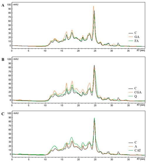 Results show that most of the applied phenolic compounds increased peaks area and total area under the curve of the chromatograms. Compared to the control sample, the least significant effect on the protein profile was observed for FA (Figure 2A) and A (Figure 2C). Similarly to electrophoretic analysis, the most prominent changes were observed for samples enriched with CGA (Figure 2B) and CAT (Figure 2C). The main effect of CGA and CAT addition to white bean paste was reflected in a significant increase of the area of the peak at range of retention time (RT) from 10 to 24 min. What is more, for CAT sample peaks overlapping (RT 12.7 min) slight shift of peaks toward to lower RT (and consequently to higher molecular size) for peaks corresponded to RT 16.2 and 17.8 were observed.