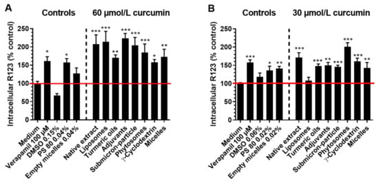Intracellular accumulation (values > 100% indicate inhibition of P-gp activity) of the P-glycoprotein substrate rhodamine 123 (R123, in % to medium control), after co-incubation of LS180 cells with 1 µg/mL R123, and formulations normalized to: (A) 60 µmol/L or (B) 30 µmol/L curcumin at 37 °C and 5% CO2. Medium served as a negative control, verapamil as a positive control, DMSO, PS80, and empty micelles as solvent controls. All data are presented as mean ± SEM, compared to the medium control, as 100% (red line). All experiments were conducted in biological triplicates (n = 3) consisting of technical duplicates. * Difference at p < 0.05; ** difference at p < 0.01; *** difference at p < 0.001 (one-way ANOVA with Dunnett’s post-hoc test). PS80, polysorbate 80.
