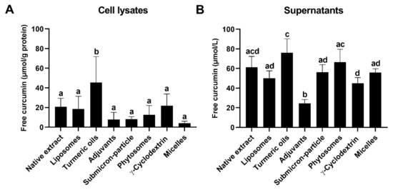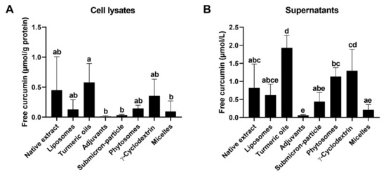 Free curcumin concentrations in (A) cell lysates in µmol/g protein and (B) supernatants in µmol/L after incubation of LS180 cells, with all formulations normalized to 60 µmol/L curcumin for 1 h at 37 °C and 5% CO2. All data are presented as mean ± SD. All experiments were conducted in biological triplicates (n = 3) and technical duplicates. Bars not sharing a common letter differ significantly at p < 0.05, consequently bars with at least one common letter do not differ significantly at p < 0.05 (one-way ANOVA with Tukey’s post-hoc test).