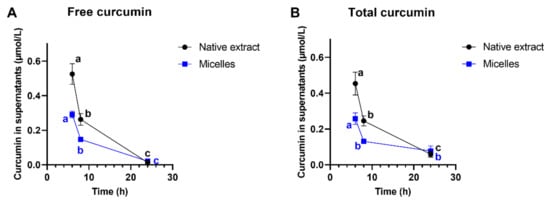(A) Free and (B) total curcumin concentrations (µmol/L) in supernatants after pre-incubation of LS180 cells for 1 h, with native or micellar curcumin normalized to 60 µmol/L, and further incubation for 6, 8, and 24 h, with curcumin-free cell culture medium. Data are presented as mean ± SEM. All experiments were conducted in biological triplicates (n = 3) consisting of technical duplicates. Values within each formulation not sharing a common letter differ significantly at p < 0.05 (one-way ANOVA with Tukey’s post-hoc test).