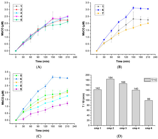 (A–C): CO-release profiles of compounds 1–9 as Mb-CO formed over time (1:6 CORM:Mb ratio); (D): T1/10 values for compounds 1–4 and 6 (defined as the time necessary for a CORM solution to produce a Mb-CO concentration of 1/10 of the initial).