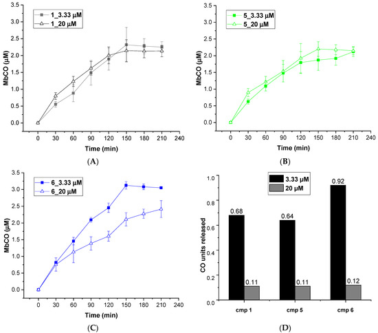 As mentioned above, an excess of the CO acceptor (Mb) stimulates the CO release from CORMs. Thus, we expected a decrease in CO release at 1:1 CO-RM:Mb ratio. As shown in Figure 3, after 210 min of incubation, compounds 1, 5 and 6 released a lower amount of CO when compared to the one observed in 1:6 conditions (Figure 2). Moreover, all the compounds released the same CO units (0.11–0.12 CO units), regardless of their different chemical structure. Therefore, disfavoring the CO release seems to reduce the differences in CO releasing efficiencies observed when Mb is present in excess (1:6/CO-RM:Mb).