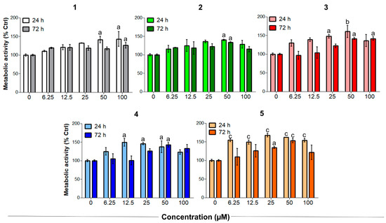 Metabolic activity of H2O2-pre-incubated human primary tendon-derived cells exposed to increasing concentrations of CORMs (compounds 1–5) after 24 and 72 h. Cells were pre-incubated with H2O2 100 µM for 3 h. The control sample (0 µM = cells pre-incubated with H2O2 and treated with DMSO 0.1%) is set as 100%. a = p < 0.01; b = p < 0.001; c = p < 0.0001 between cells treated with CORMs and the control sample.
