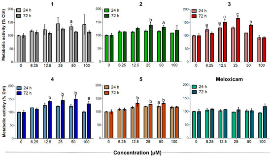 Metabolic activity of human primary tendon-derived cells exposed to increasing concentrations of CORMs (compounds 1–5) after 24 and 72 h. The control sample (0 µM = cells treated with DMSO 0.1%) is set as 100%. a = p < 0.01; b = p < 0.001; c = p < 0.0001 between cells treated with CORMs and the control sample.